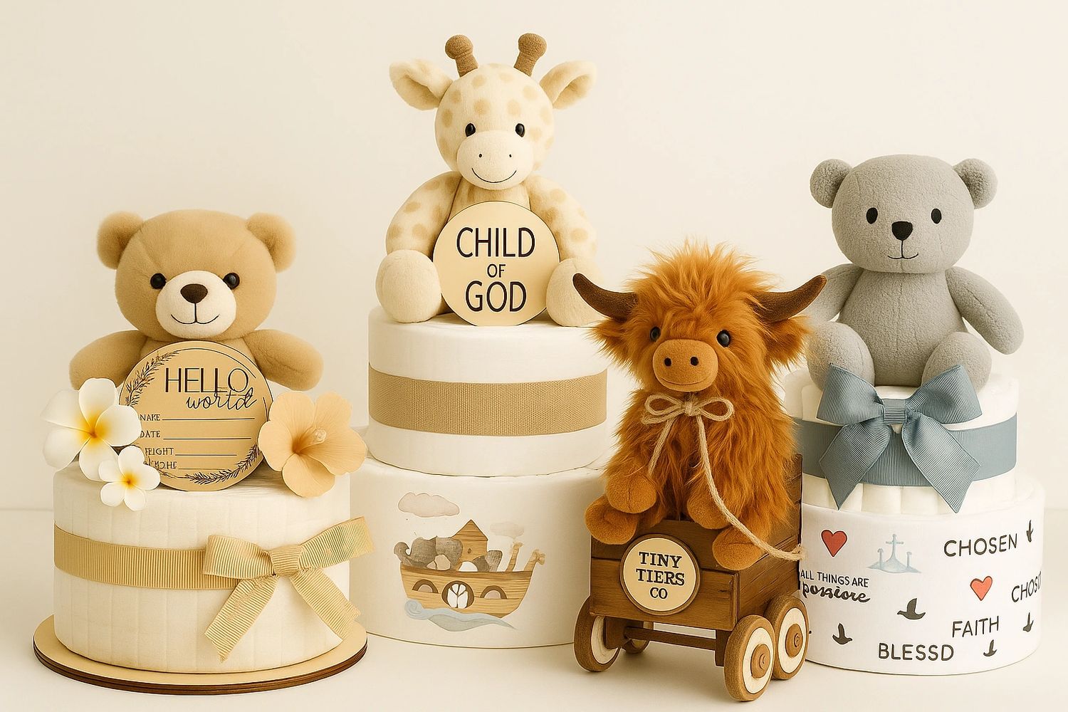 Tiny Tiers Co. was created from a place of joy, creativity, and faith. What began as a small idea grew into a passion for designing beautiful baby gifts — from diaper cakes and keepsake arrangements to wagons, onesie cupcakes, and personalized treasures.